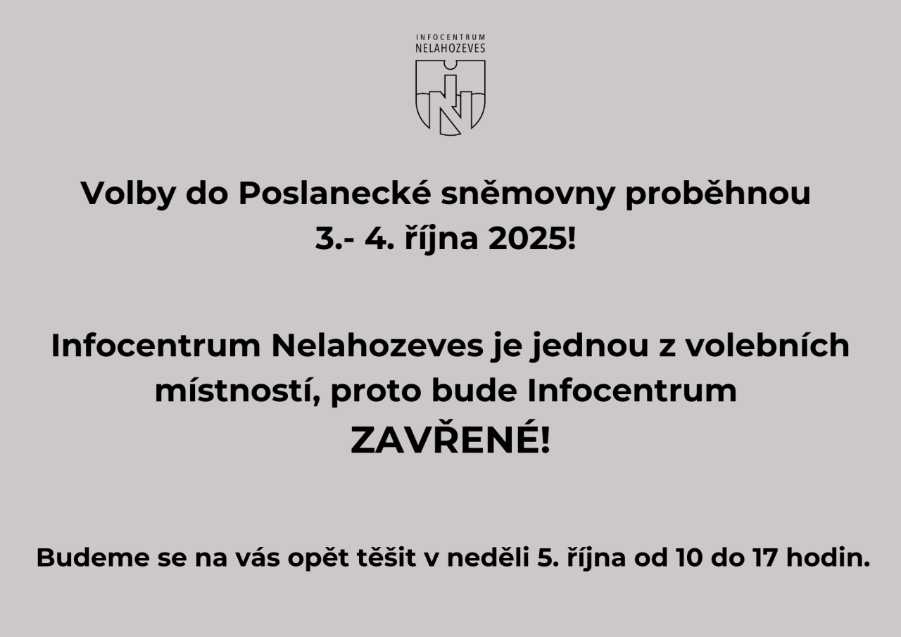 Volby do Poslanecké sněmovny proběhnou 3.- 4. října 2025. Infocentrum Nelahozeves je jednou z volebních místností, proto bude Infocentrum ZAVŘENÉ!