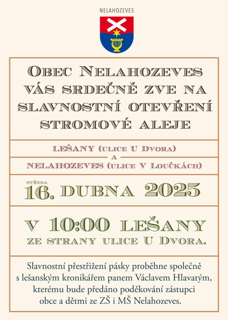 Obec Nelahozeves Vás srdečně zve na SLAVNOSTNÍ OTEVŘENÍ STROMOVÉ ALEJE
